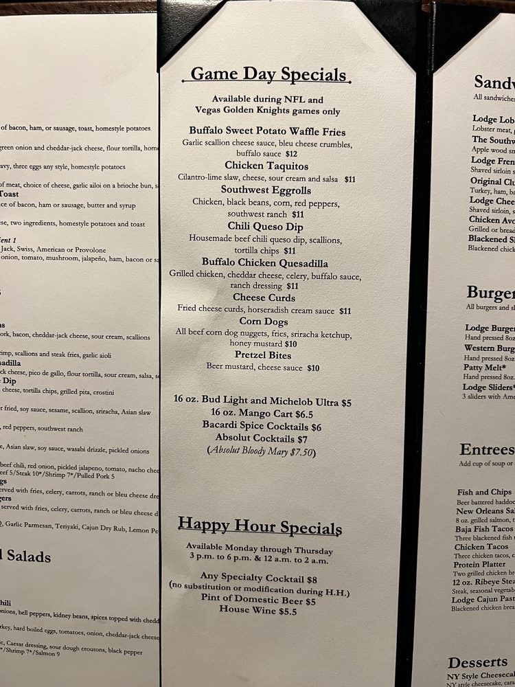 Introducing The Lodge Fort Apache. Located in Las Vegas, this casual, cozy spot offers a range of amenities including pool tables, a full bar, and outdoor seating. Customers rave about the friendly service and delicious food, with highlights such as bacon chicken quesadillas and wings. The atmosphere is described as warm and welcoming, perfect for gatherings with friends. The staff, including servers like Chanda and bartenders like Jess, receive glowing reviews for their attentiveness and good vibes. Whether you're looking for a fun night out or a relaxed meal, The Lodge Fort Apache is the place to be. Don't miss out on their happy hour specials and be sure to say hi to Wyatt for exceptional service that will make you feel right at home.